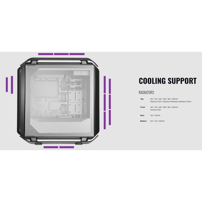 Systém vodního chlazení: Horní 120/140/240/280/360/420mm slot, Přední 120/140/240/280/360/420mm slot, Spodní 120/140/240mm slot, Zadní 120/140mm slot