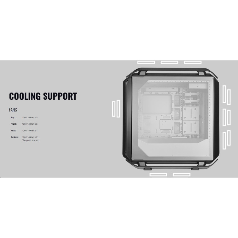 Pozice pro ventilátory: Horní 3x120/140mm, Přední 3x120/140mm, Spodní 2x120/140mm, Zadní 1x120/140mm