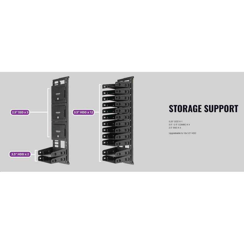 Počty pozic: Externí 5,25" (1x), Interní 2,5" (4-8x), Interní 3,5" (4x)