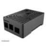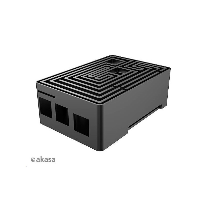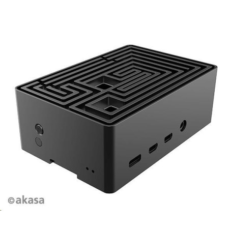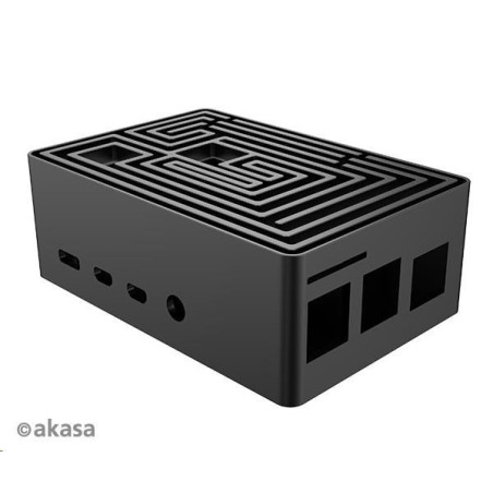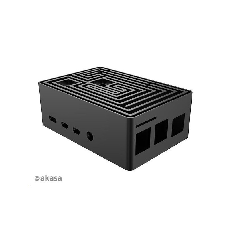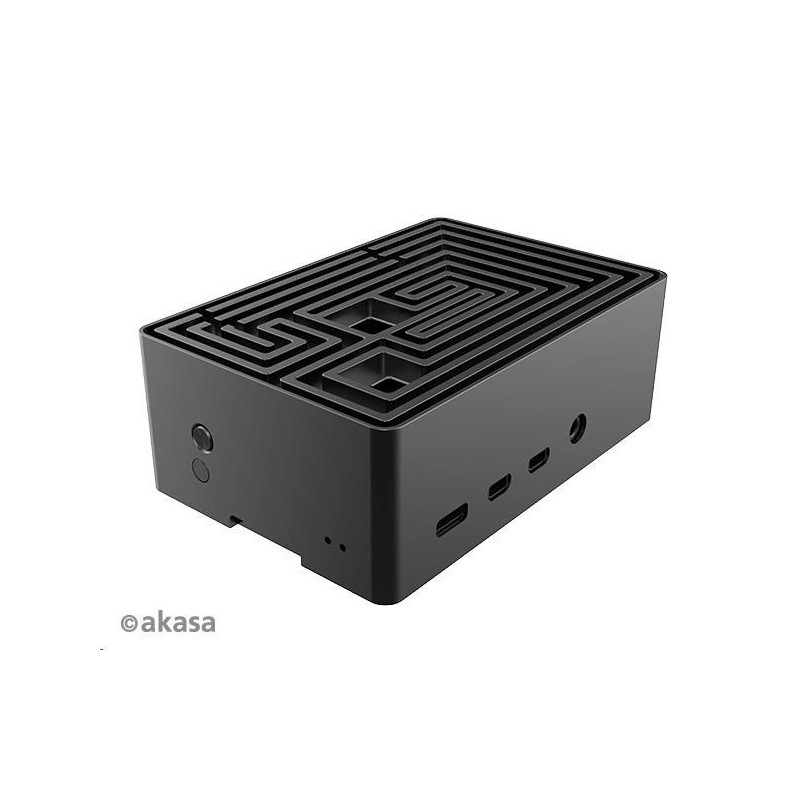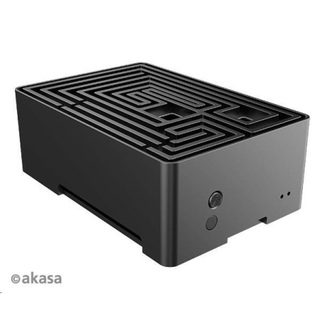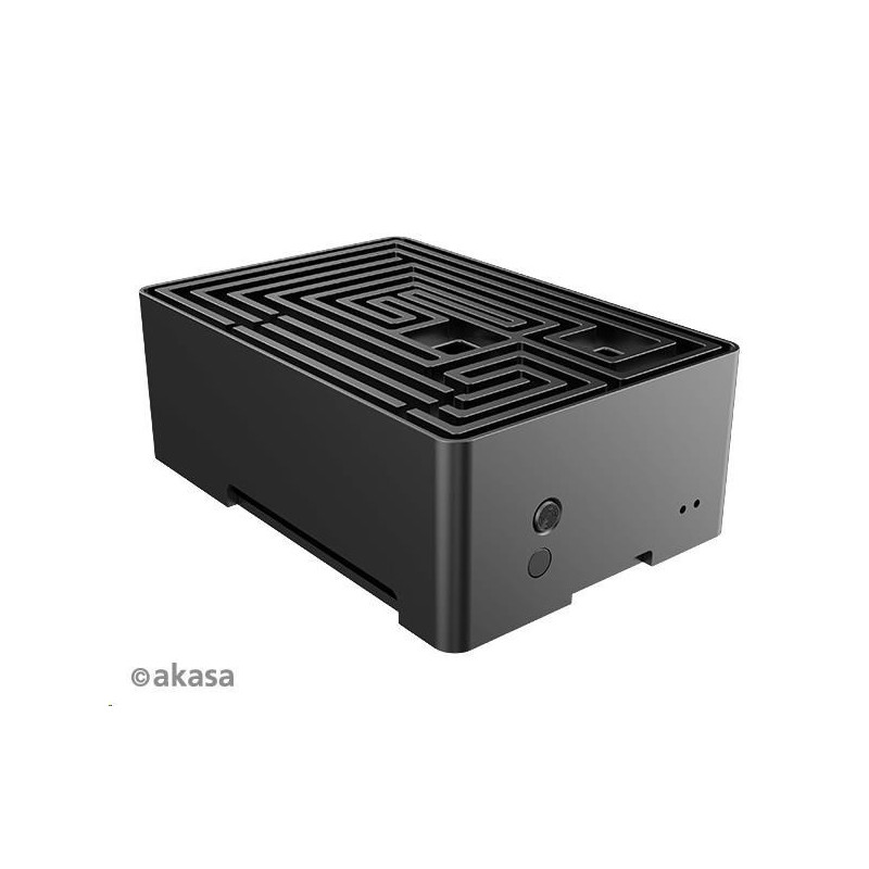 Černá eloxovaná skříň s nápadným designem bludiště nahoře. Vestavěné duální hliníkové jádro tiše chladí Raspberry Pi 4. Je vybavena přeprogramovatelným tlačítkem napájení a skrytou kartou SD pro komerční produkci systému.