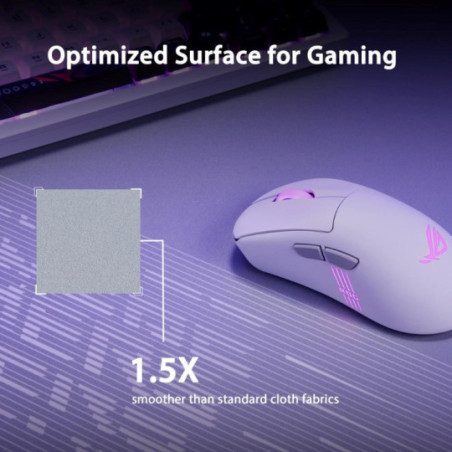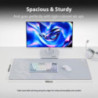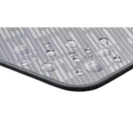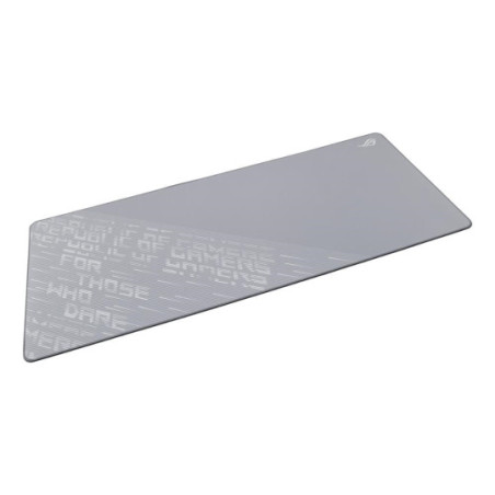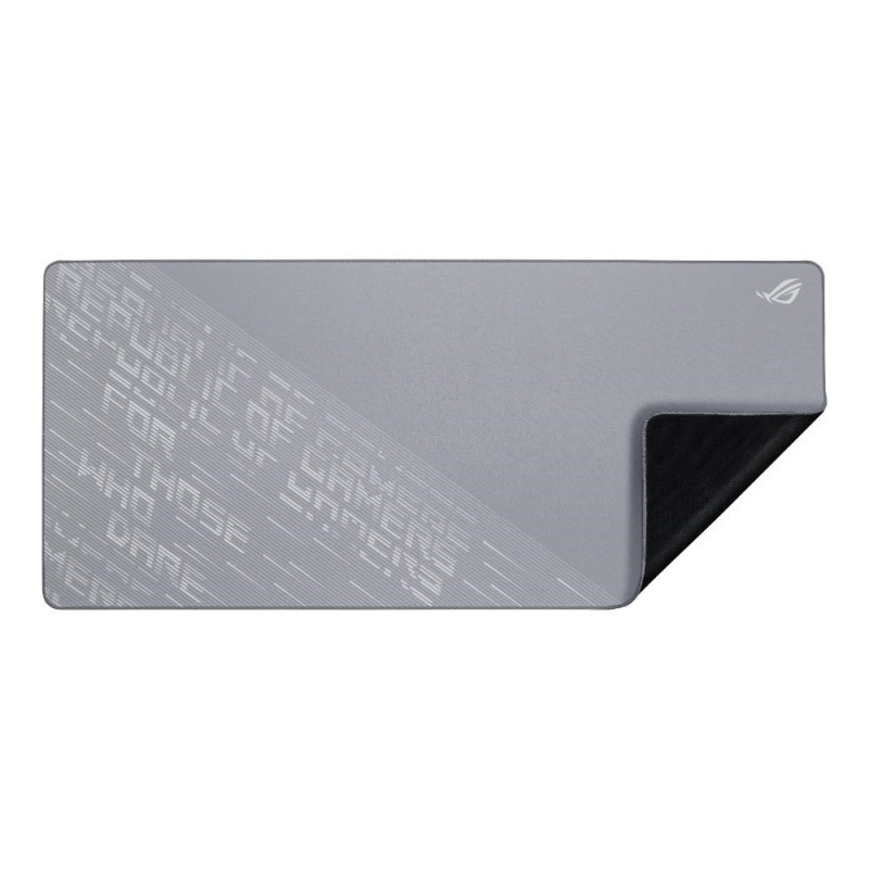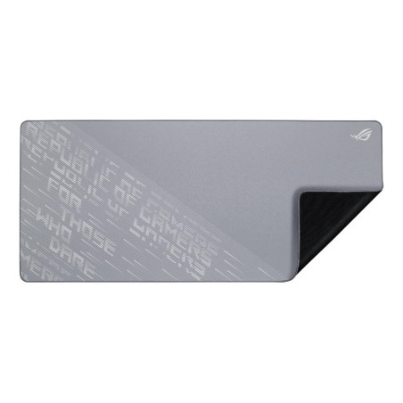 ROG Scabbard II Arctic Gray XXL je velká herní podložka pod myš s povrchem odolným proti vodě, oleji a prachu, s plochými prošitými okraji proti oděru a protiskluzovou gumou dole.