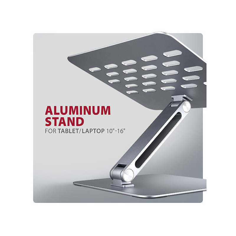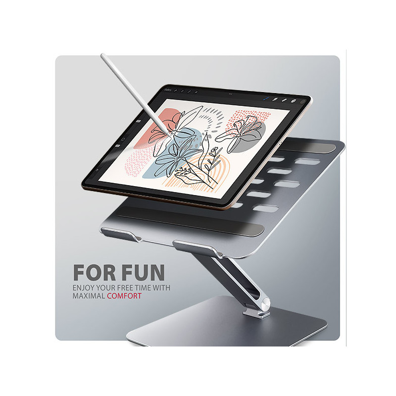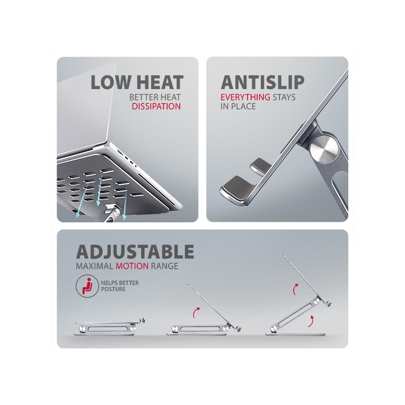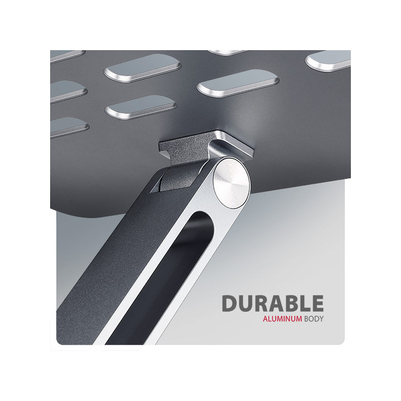 Podstavec je vyroben z robustních hliníkových odlitků garantujících dlouhou životnost a spolehlivost. Díky protiskluzové úpravě se nemusíte obávat nežádoucích pohybů - vaše zařízení zůstane pevně na svém místě, a to bez poškození povrchu notebooku či podložky. Tyto pečlivě navržené vlastnosti zaručují perfektní stabilitu pro váš notebook, tablet nebo dokonce oblíbenou knihu, což vám poskytne klid a pohodlí při každodenním používání.