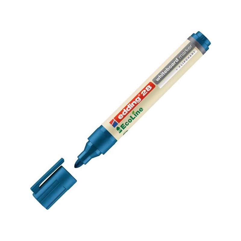 *Modrý popisovač na bílé tabule z ekologické řady edding Ecoline *Tělo popisovače je nejméně z 90 % vyrobené z recyklovaných materiálů *Vyměnitelný hrot a možnost znovu naplnění vypsaného popisovače pomáhá snižovat množství odpadu, takže je šetrný k životnímu prostředí *Popisovač je vhodný na emailové a melaminové tabule *Sytá stopa rychle zasychá a je zasucha stíratelná *Díky inkoustu "cap-off" vydrží popisovač bez víčka i několik dní aniž by vyschl *Inkoust neobsahuje butylacetát *Víčko je opatřeno klipem, který zabrání skutálení popisovače z vodorovného povrchu *Šíře stopy: 1,5 - 3 mm *Kulatý hrot *Množství v originálním balení: 10 ks