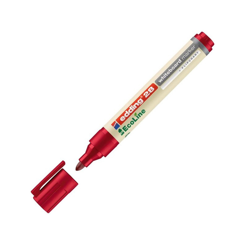 *Červený popisovač na bílé tabule z ekologické řady edding Ecoline *Tělo popisovače je nejméně z 90 % vyrobené z recyklovaných materiálů *Vyměnitelný hrot a možnost znovu naplnění vypsaného popisovače pomáhá snižovat množství odpadu, takže je šetrný k životnímu prostředí *Popisovač je vhodný na emailové a melaminové tabule *Sytá stopa rychle zasychá a je zasucha stíratelná *Díky inkoustu "cap-off" vydrží popisovač bez víčka i několik dní aniž by vyschl *Inkoust neobsahuje butylacetát *Víčko je opatřeno klipem, který zabrání skutálení popisovače z vodorovného povrchu *Šíře stopy: 1,5 - 3 mm *Kulatý hrot *Množství v originálním balení: 10 ks