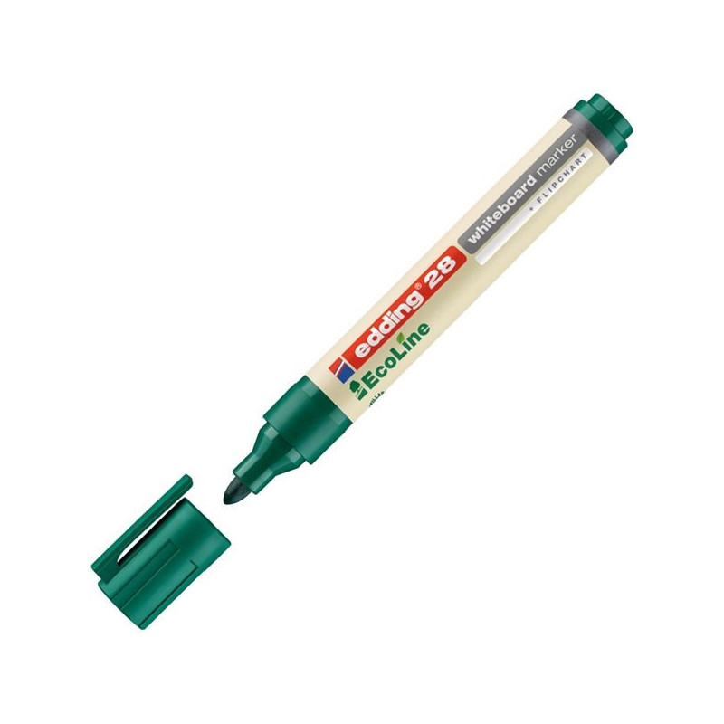 *Zelený popisovač na bílé tabule z ekologické řady edding Ecoline *Tělo popisovače je nejméně z 90 % vyrobené z recyklovaných materiálů *Vyměnitelný hrot a možnost znovu naplnění vypsaného popisovače pomáhá snižovat množství odpadu, takže je šetrný k životnímu prostředí *Popisovač je vhodný na emailové a melaminové tabule *Sytá stopa rychle zasychá a je zasucha stíratelná *Díky inkoustu "cap-off" vydrží popisovač bez víčka i několik dní aniž by vyschl *Inkoust neobsahuje butylacetát *Víčko je opatřeno klipem, který zabrání skutálení popisovače z vodorovného povrchu *Šíře stopy: 1,5 - 3 mm *Kulatý hrot *Množství v originálním balení: 10 ks
