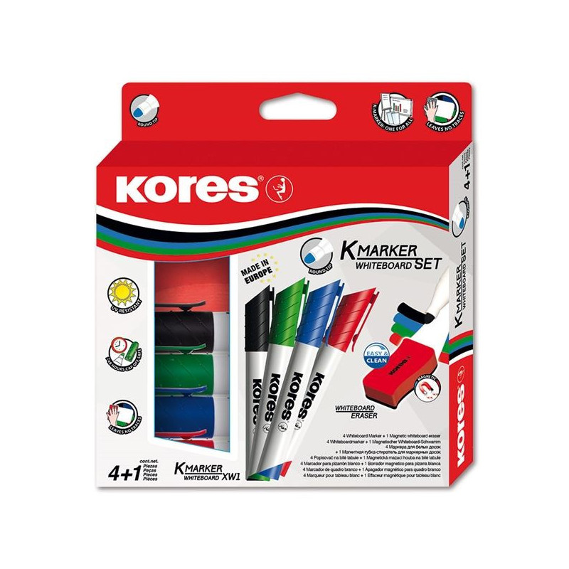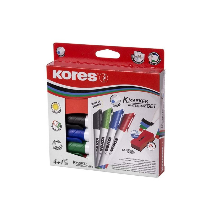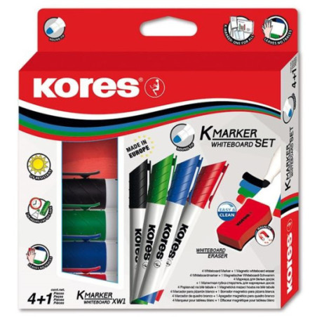 * Sada popisovačů na bílé tabule a flipcharty s magnetickou houbičkou * Stopa rychle zasychá, nezanechává šmouhy * Lze použít na sklo a další neporézní povrchy * Popisovač vydrží bez víčka min. 48 hod. * Šíře stopy: 3,0 mm; kulatý hrot * Magnetická stírací houbička umožňuje přichycení na kovovém povrchu tabule; rozměry houbičky: 11,0 × 5,5 × 2,0 cm