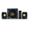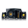 Designové herní reproduktory v konfiguraci 2.1 s celkovým výkonem 80 W. Díky přítomnému zesilovači, který disponuje samostatným ovládáním hlasitosti a basů si můžete užít dunivý zvuk dle libosti. Na předním panelu se nachází také sluchátkový výstup a vstup pro mikrofon. Na zadní straně jsou poté k dispozici konektory pro připojení k počítači, televizoru či DVD přehrávači.
