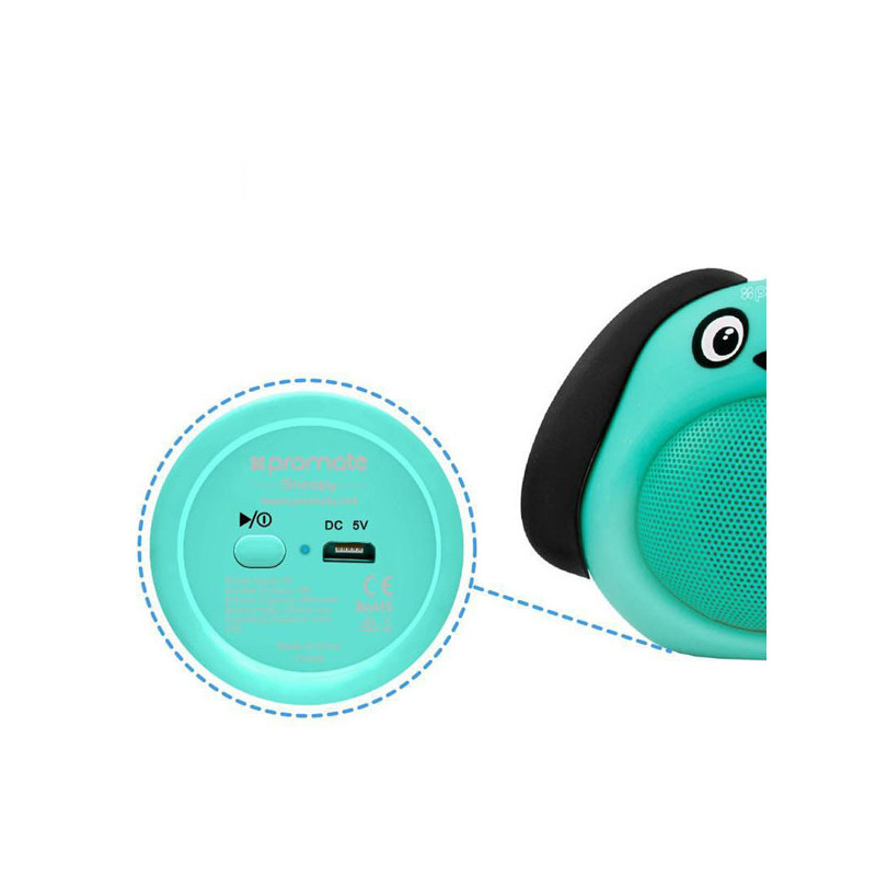 Promate Snoopy je bezdrátový reproduktor, který vykouzlí úsměv na tváři Vašich dětí. Kompaktní rozměry reproduktoru umožňují přenášet reproduktor kdekoli budete chtít. Bezdrátový reproduktor funguje pomocí technologie Bluetooth a umožňuje bezdrátové připojení až do vzdálenosti 10 metrů. Je také možné připojit se pomocí AUX konektoru (Jack 3.5mm). Zabudovaný mikrofon navíc umožňuje využít reproduktor k handsfree hovoru.