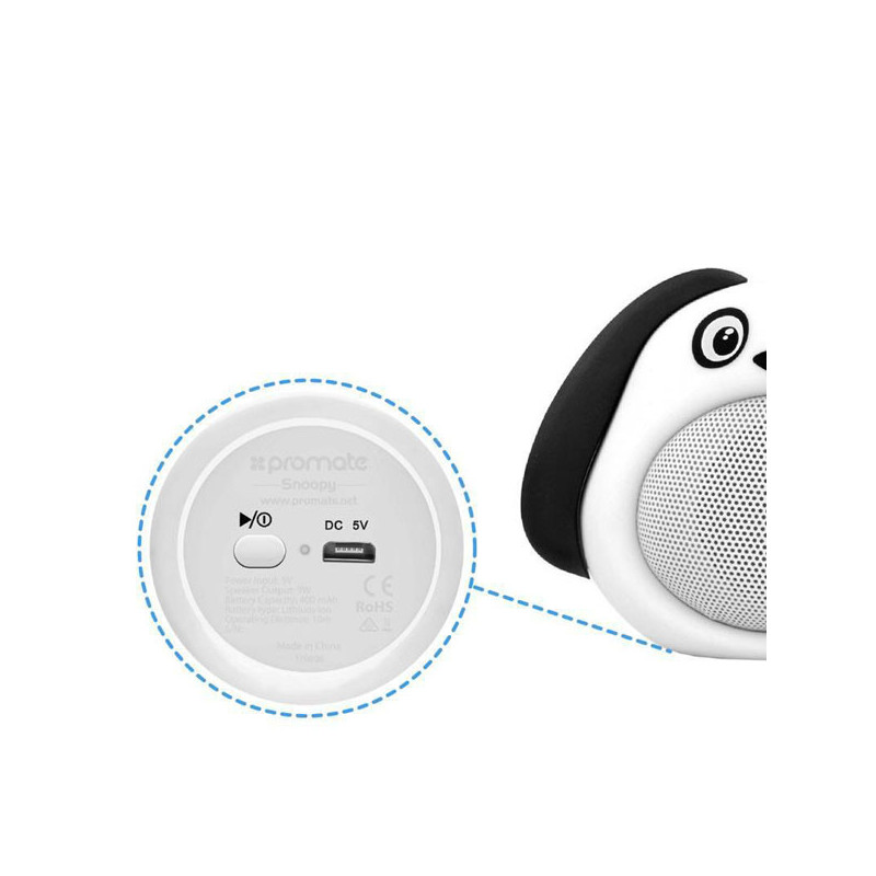 Promate Snoopy je bezdrátový reproduktor, který vykouzlí úsměv na tváři Vašich dětí. Kompaktní rozměry reproduktoru umožňují přenášet reproduktor kdekoli budete chtít. Bezdrátový reproduktor funguje pomocí technologie Bluetooth a umožňuje bezdrátové připojení až do vzdálenosti 10 metrů. Je také možné připojit se pomocí AUX konektoru (Jack 3.5mm). Zabudovaný mikrofon navíc umožňuje využít reproduktor k handsfree hovoru.