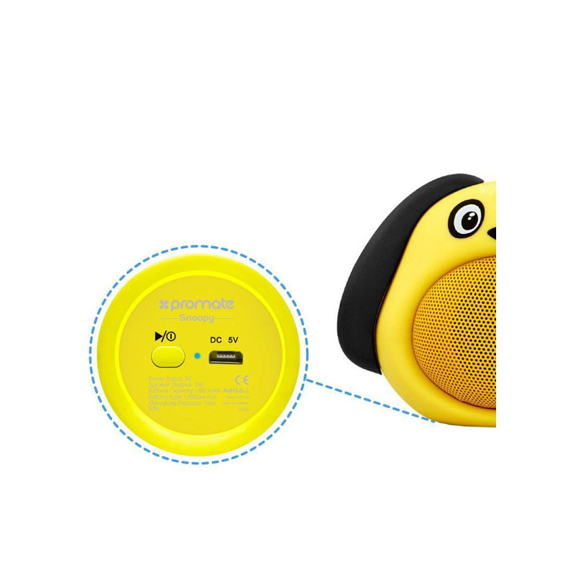 Promate Snoopy je bezdrátový reproduktor, který vykouzlí úsměv na tváři Vašich dětí. Kompaktní rozměry reproduktoru umožňují přenášet reproduktor kdekoli budete chtít. Bezdrátový reproduktor funguje pomocí technologie Bluetooth a umožňuje bezdrátové připojení až do vzdálenosti 10 metrů. Je také možné připojit se pomocí AUX konektoru (Jack 3.5mm). Zabudovaný mikrofon navíc umožňuje využít reproduktor k handsfree hovoru.