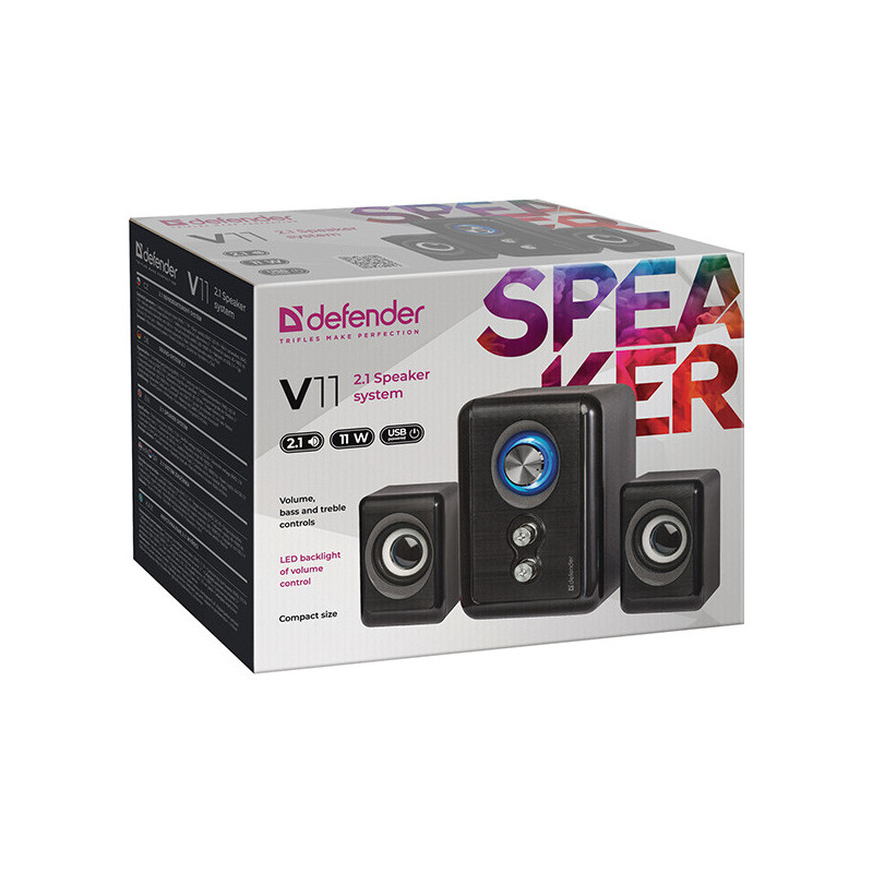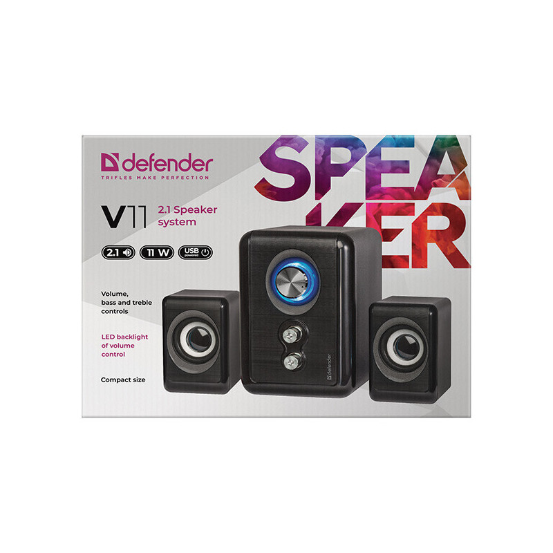 Pro ten nejlepší zážitek nejen z hudby Vám nabídne reproduktorová soustava Defender V11. Ačkoliv se to na první pohled nezdá, tato kompaktní soustava, kterou si můžete klidně i přibalit k notebooku, dokáže obohatit každý moment, kde zvuk hraje nějakou roli. V11 disponuje nejen (již standardní) možností nastavení hlasitosti, ale nabídne i individuální ovládací prvek pro nastavení basů a výšek. Reproduktorová soustava má moderní a čistý design a společně s podsvíceným regulátorem hlasitosti se V11 bude vyjímat na téměř každém stole.