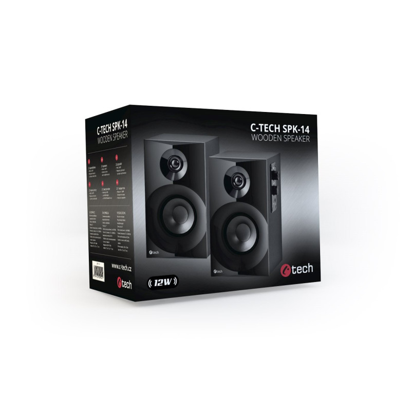 Dřevěné dvoupásmové reproduktory C-TECH SPK-14 jsou díky svému designu vhodné do moderně zařízených kanceláří nebo pokojů. Na bočním panelu reproduktorů se nachází ovládání hlasitosti a praktický výstup na sluchátka. Tato reprosoustava nabídne celkový výkon 12W RMS, což je dost i na kvalitní a hlasitý poslech hudby. Reproduktory jsou napájeny z elektrické sítě a k PC se připojují přes 3,5mm jack kabel