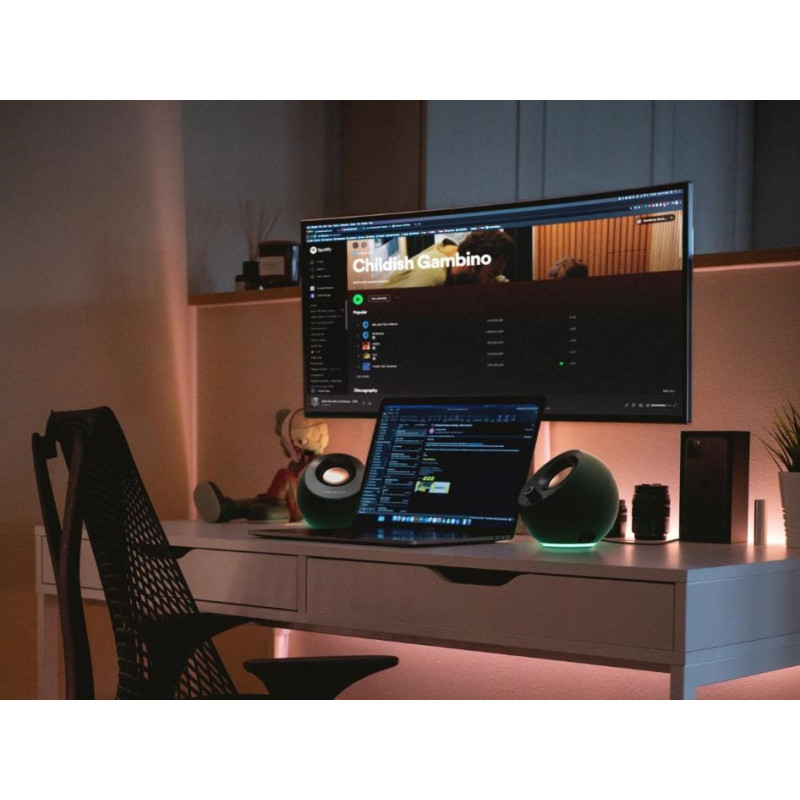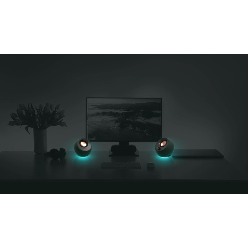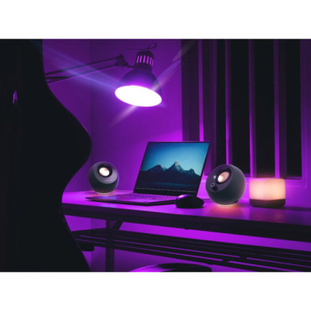 Díky širokému výběru barev a 3 světelným efektům si můžete vybrat nastavení, které bude vyhovovat konkrétní požadované atmosféře. Osvětlení RGB reproduktorů Creative Pebble Pro dokáže procházet spektrem barev, pulzovat do rytmu nebo třeba jen svítit jednobarevnou září. Když je čas skončit, RGB se dá snadno vypnout pomocí ovládacího tlačítka RGB.