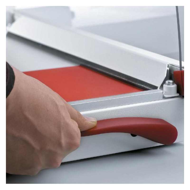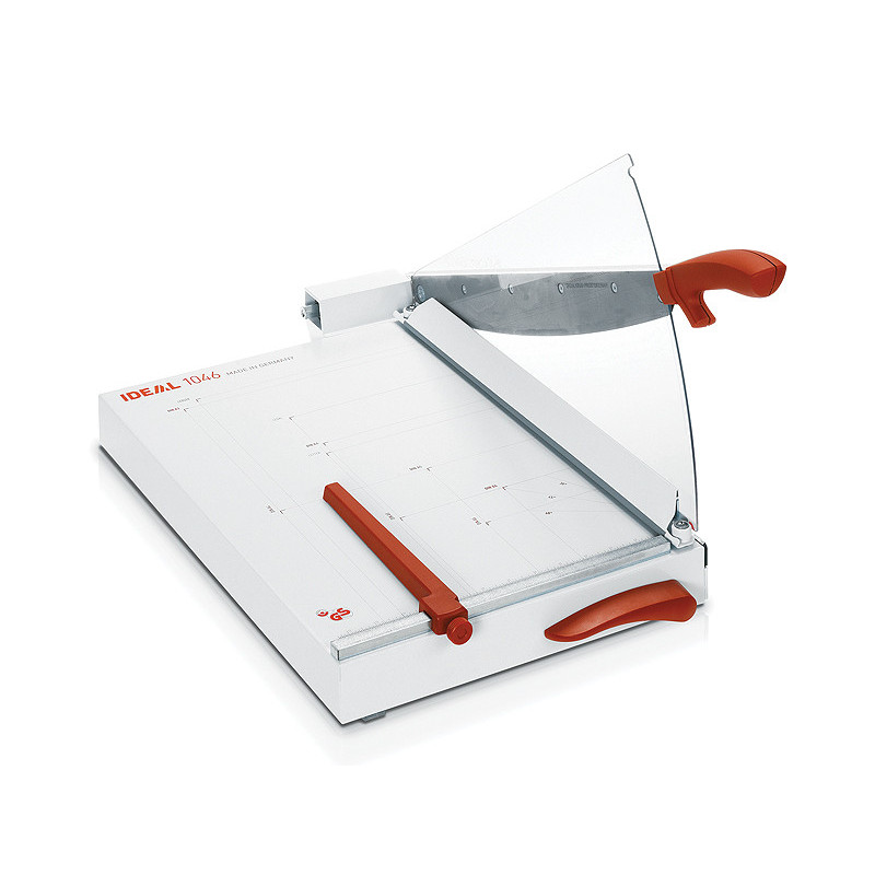 INOVOVANÝ MODEL ŘEZAČKY (PŮVODNÍ MODE Ideal 1043) S AUTOMATICKÝM PŘÍTLAKEM STOHU. Délka řezu 460 mm Automatický přítlak pro precizní, komfortní řezání EASY LIFT - páka k nadzvednutí přítlaku pro pohodlné odebrání řezaného materiálu Stabilní celokovová konstrukce, velký pracovní stůl Vysoce kvalitní nůž Solingen, který je možné dobrousit Obzvláště stabilní upevnění nože Transparentní kryt nože s integrovaným vyznačením řezu Precizní boční doraz, zadní dorazStupnice v mm/inch (palce) DIN formáty velikosti A3 – A6 a další vyznačené na pracovním stole Gumové nožky Atraktivní a funkční design