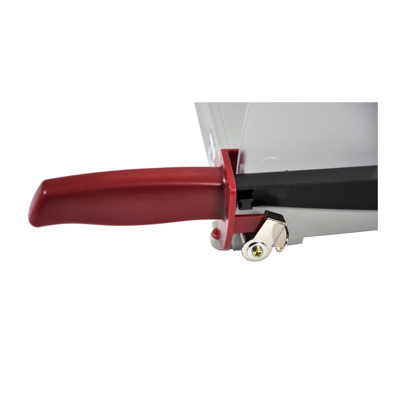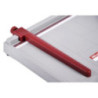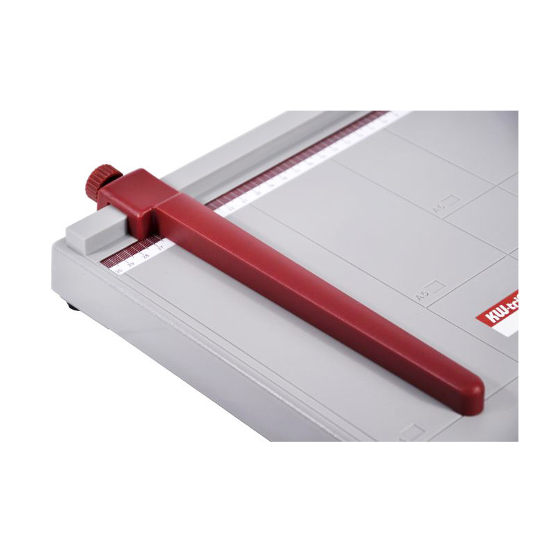Hobby páková řezačka A4 s plastovým ochranným krytem a plastovou základnou s oděruvzdorným povrchem ABS, s vyznačenými měřítky a DIN formáty a posuvným dorazem papíru se šroubovou aretací.