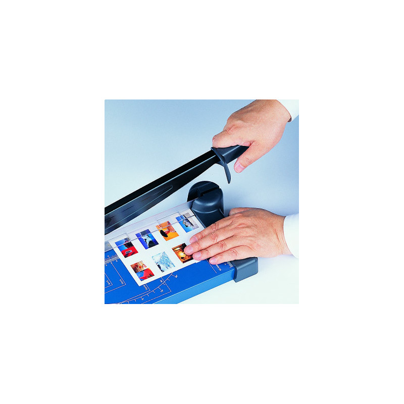 Páková řezačka A4 s kovovým stolem, která díky inovované konstrukci dokonale uřízne nebroušeným nožem o řeznou hranu až 8 listů papíru. Stůl je vybaven natištěnými měřítky, foto formáty a úhelníkem.