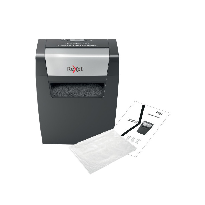 Nezastavitelná skartovačka! Rexel Momentum X406 skartuje až 6 listů najednou a vydrží v nepřetržitém chodu 3 minuty, vhodná pro domácí použití *Křížový řez na úrovni zabezpečení P4 řeže papír na malé části o velikosti 4x28 mm *Odpadní koš s kapacitou 15 l pojme 125 listů A4*Rozměry: 32,5 x 34,3 x 22,9 cm (š x v x h)