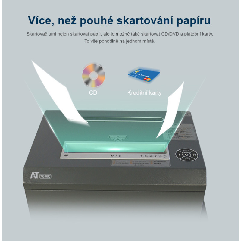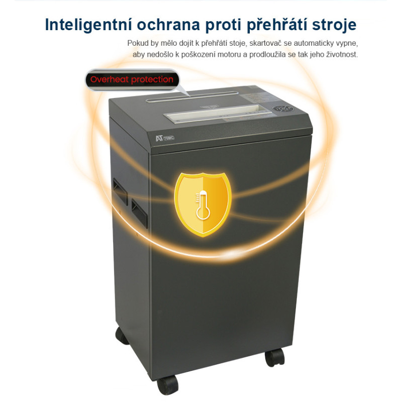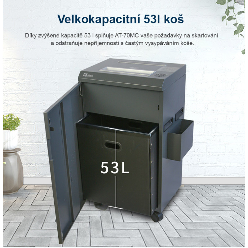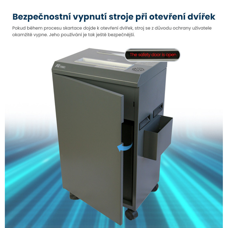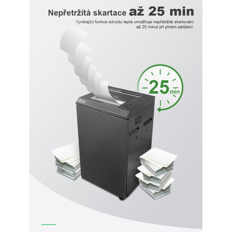 Robustní skartovací stroj praktického designu v odolném plechovém provedení, s příznivým poměrem cena/výkon. Vhodný pro skartování dokumentů o šíři do 270 mm. LCD display pro kontrolu zapnutých funkcí.Stroj je standardně vybaven automatickým systémem start/stop, zpětným chodem, tepelnou pojistkou motoru proti přehřátí a signalizací přeplněného koše.Lze skartovat sešívací a kancelářské sponky, kreditní karty nebo CD.Velmi tichý chod stroje pod 55 dB. Snadno vyprázdnitelná odpadní nádoba o objemu 53 l. Stroj je opatřen kolečky pro snadnou manipulaci. Snadná manipulace s plným košem díky vloženému zásobníku, který odpovídá požadavkům směrnice EU pro zacházení s odpadem.Stupeň utajení dle NBÚ podle nové NNI 2 - důvěrné.
