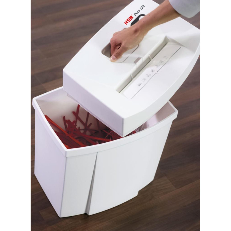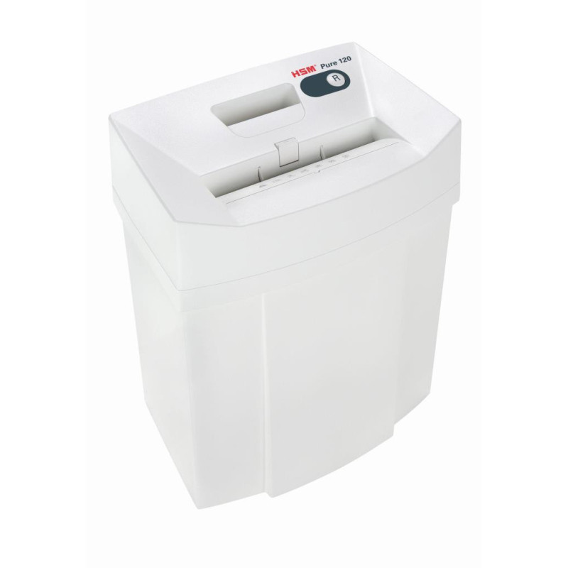 Nejmenší skartovací stroj z nové řady HSM Pure „ke stolu“. Konstrukce je dvoudílná, se snímatelnou hlavou a praktickým madlem. Ovládání je automatické, s výkyvným spínačem, který zajišťuje nulovou spotřebu elektrické energie ve STAND-BY režimu. Vstupní otvor je chráněn bezpečnostní klapkou, která v případě kontaktu vypíná chod skartovače. Při zahlcení nožů se automaticky zapíná zpětný chod. Stroj je rovněž vybaven tlačítkem pro manuální spuštění zpětného chodu. Uvedený skartovač vyniká tichým chodem, má praktický průhled do objemného zásobníku na skartovaný odpad pro možnost kontroly stavu naplnění. Odolné nože ze zakalené oceli umožňují skartování dokumentů s kovovými kancelářskými sponkami a plastových karet. Mají doživotní záruku proti výrobním vadám. Stupně utajení dle GDPR: P-2 / T-2 / E-2