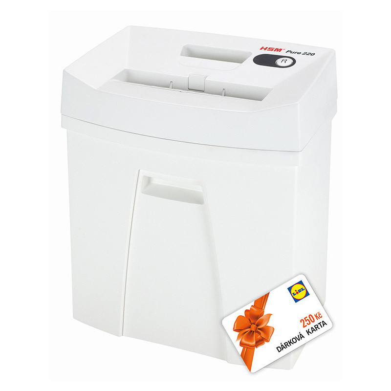 Skartovací stroj ke stolu z řady HSM Pure. Vyniká jak svými technickými parametry a užitnými vlastnostmi, tak i vzhledem. Stroj má dvoudílnou konstrukci se snímatelnou hlavou. Pro usnadnění manipulace při vyprazdňování zásobníku je skartovací hlava opatřena praktickým madlem. Ovládání je automatické, s výkyvným spínačem, který zajišťuje nulovou spotřebu elektrické energie ve STAND-BY režimu. Vstupní otvor je chráněn bezpečnostní klapkou, která v případě kontaktu vypíná chod skartovače. Při zahlcení nožů se automaticky zapíná zpětný chod. Stroj je rovněž vybaven tlačítkem pro manuální spuštění zpětného chodu. Charakteristická je snížená hlučnost v průběhu skartování.Odolné nože z kvalitní oceli umožňují skartování dokumentů s kovovými kancelářskými sponkami a plastových karet. Stroje mají doživotní záruku na nože proti výrobním vadám.Stupně utajení dle GDPR: P-4 / T-4 / E-3 / F-1VIDEO - HSM Pure 220 4x25 mmVíce o značce HSM