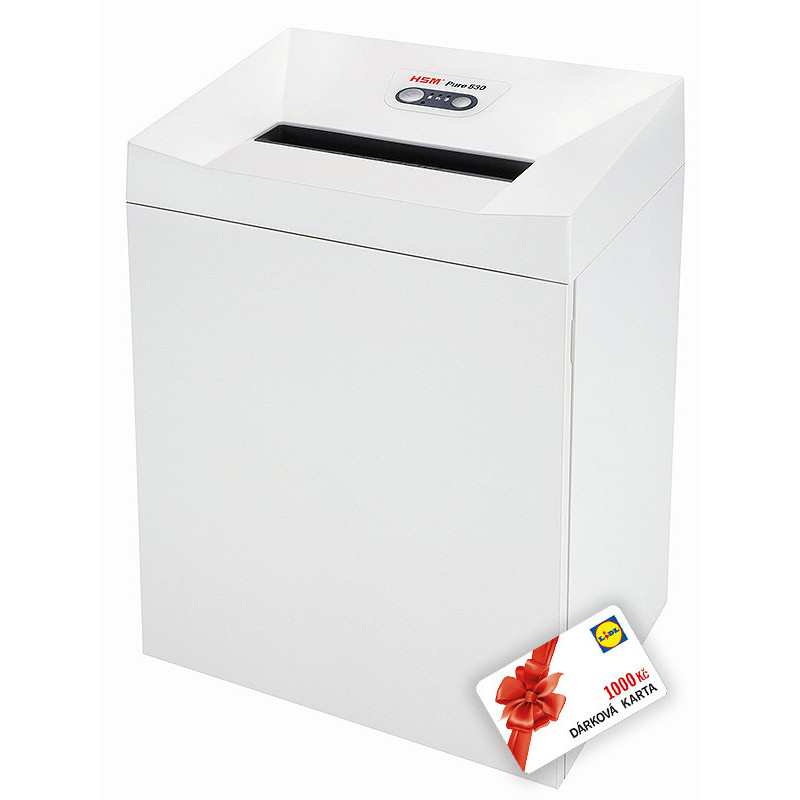 Skartovací stroje PURE 530, mají rozšířený vstup na skartování papírů formátu A3 a zvětšený zásobník o objemu 80 l. Stejně jako ostatní stroje této nové řady byly vyvinuty v souladu s nejnovějšími trendy v kancelářské technice. Jsou tiché, spolehlivé, plně automatické, s důrazem na úsporu elektrické energie dle zásad EMCS. Multifunkční tlačítko zjednodušuje obsluhu, je doplněno kontrolkami plného zásobníku, zahlcení nožů, otevřeného zásobníku a STAND-BY režimu. Na spuštění zpětného chodu je stroj vybaven odděleným tlačítkem. Skartovač se zapíná stisknutím multifunkčního tlačítka. Po uplynutí 2 minut od posledního skartování se stroj přepíná do energeticky úsporného režimu, po delší době se automaticky zcela vypíná. V případě zahlcení spouští řídící deska zpětný chod. Kryt u vstupního otvoru je vybaven bezpečnostním dotykovým spínačem. Objemný zásobník na skartovaný papír je vybaven závěsem na plastové pytle. Pro potřebu separace odpadu při skartování plastových karet nebo CD/DVD se pod skartovací hlavou nasunuje speciální tkaninový vak. Skartovač je vybaven otočnými pojezdovými kolečky.Stupně utajení dle GDPR: P-2 / O-2 / T-2 / E-2