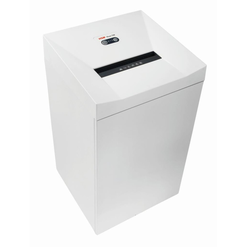 HSM Pure 730 je výkonný skartovací stroj s možností zpracování papírů formátu A3. Má zvýšený výkon, nože šířky 330 mm a zvětšený zásobník s objemem 170 l. Svými parametry vyhoví potřebám náročnějších uživatelů, kteří zpracovávají velká množství papírů různých formátů. Stejně jako ostatní stroje řady PURE byl vyvinut v souladu s nejnovějšími trendy v kancelářské technice. Je tichý, spolehlivý, plně automatický, s důrazem na úsporu elektrické energie dle zásad EMCS. Stroj má ve všech řezech automatický zpětný chod při zahlcení nožů. Jednoduché ovládání zajišťuje multifunkční, je vybaveno indikací plného zásobníku, zahlcení nožů, otevřeného zásobníku a STAND-BY režimu. Pro případ potřeby manuálního spuštění zpětného chodu je stroj vybaven odděleným tlačítkem. Kryt u vstupního otvoru je vybaven bezpečnostním dotykovým spínačem. Stroje v řezech, umožňujících skartování CD (3,9 mm, 5,8 mm a 4,5x30 mm). Zvětšený zásobník na skartovaný papír objemu 170 l je vybaven závěsem na plastové pytle, má průzor na jednoduchou kontrolu naplnění. Pro potřebu separace odpadu při skartování plastových karet nebo CD/DVD se pod skartovací hlavou nasunuje speciální tkaninový vak. Skartovač je vybaven otočnými pojezdovými kolečky.Stupně utajení dle GDPR: P-4 / O-3 / T-4 / E-3 / F-1