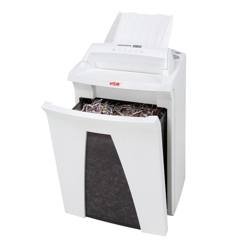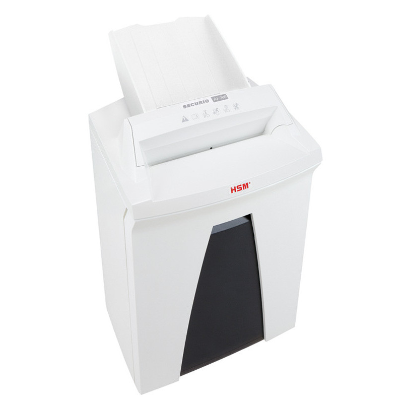 Moderní skartovací stroj s automatickým podavačem dokumentů. Papíry ke skartování lze vkládat přímo do skartovací štěrbiny ovládané fotobuňkou nebo do otevřeného zásobníku s kapacitou až 300 listů.Nabírání zajišťují otočné segmenty s technologií nanogrip, které jsou spolehlivé i při odebírání dokumentů tištěných na nestejných papírech.Masivní nože v jemném křížovém řezu mají vysoký stupeň utajení. Umožňují zpracování papíru s kancelářskými sponkami a plastových karet. Do odpadní nádoby lze umístit plastový sáček (není nutné).HSM Securio AF300 vyniká tichým chodem, zvýšeným výkonem, spolehlivostí a úsporou elektrické energie v pohotovostním režimu (EMCS).Záruka na stroj 36 měsíců, doživotní záruka na nože.