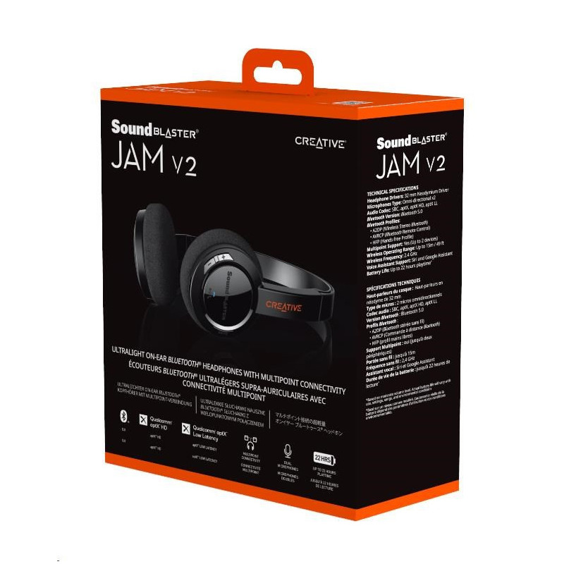 Vaše oblíbená přenosná Bluetooth sluchátka na uši jsou zpět – se stejným designem lehkým jako pírko a vysoce kvalitními neodymovými měniči! Produkt Sound Blaster JAM V2 je nyní vybaven technologií Bluetooth 5.0. Společně s rozšířenými zvukovými kodeky aptX™ HD a aptX™ Low Latency poskytuje nejlepší bezdrátový poslech. Užijte si bohatý a dechberoucí zvuk. Funkce Multipoint umožňuje zřetelně přepínat mezi dvěma různými zdrojovými zařízeními Bluetooth, aniž byste vyšli z rytmu.