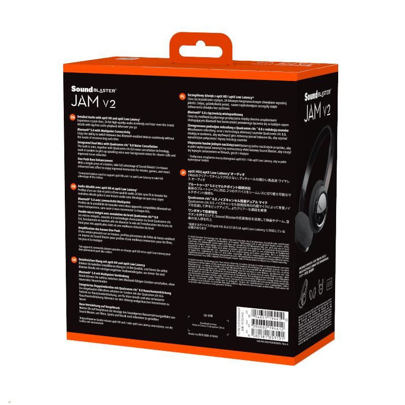 Sluchátka Sound Blaster JAM V2 jsou vybavena dvěma mikrofony a technologií potlačení šumu Qualcomm cVc™ 8.0. Tyto funkce se společně doplňují, aby zachytily váš hlas a potlačily šum na pozadí. Díky tomu je volání v režimu Bluetooth báječným zážitkem.