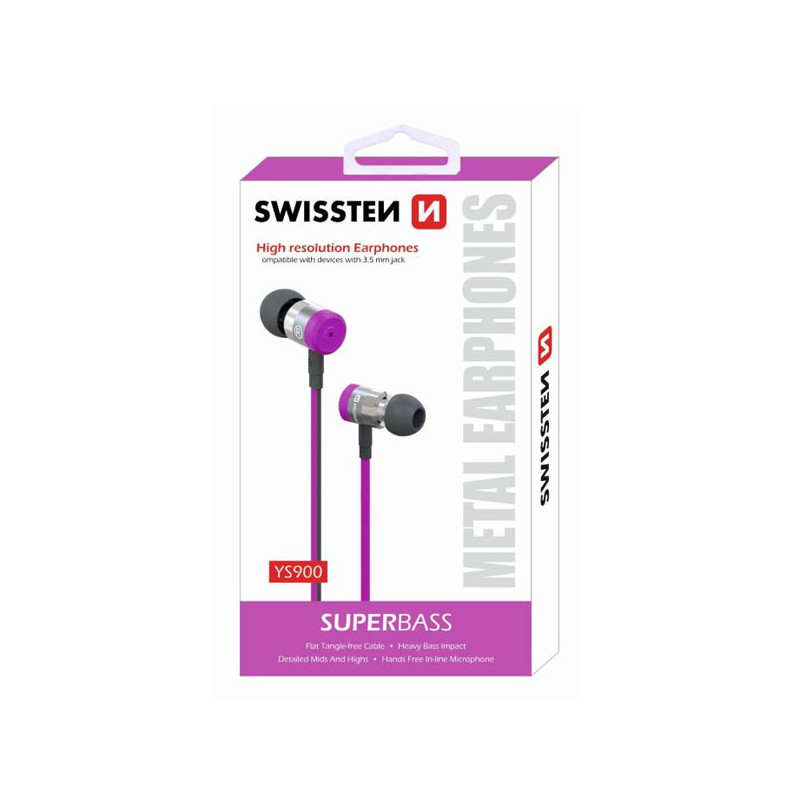 Sluchátka Swissten YS900 pocházejí z modelové řady SuperBass a vynikají především ostrým a přesným zvukem. Dále vynikají i pohledným moderním designem s kovovými prvky. Sluchátka disponují integrovaným mikrofonem a funkčním tlačítkem. Tímto tlačítkem lze ovládat hovory a hudbu. Sluchátka nabízejí konektor jack 3.5mm.