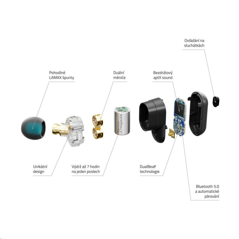 V čem je vtip duálních měničů s naší LAMAX DualBeat technologií? Každý měnič se stará o svoje zvukový spektrum. Pro tučný basy používáme o třetinu lehčí titanovou membránu, pro křišťálově čistý středy a výšky naopak membránu se silnou tuhostí. Perfektní poměr frekvencí pro každej track z tvýho playlistu potom řídí naše LAMAX DualBeat technologie, která oba výstupy pošle na finální mix až do tvýho ucha. Navíc v top bezdrátový kvalitě, díky kodeku aptX, který boostuje přenosovou rychlost Bluetooth 5.0.