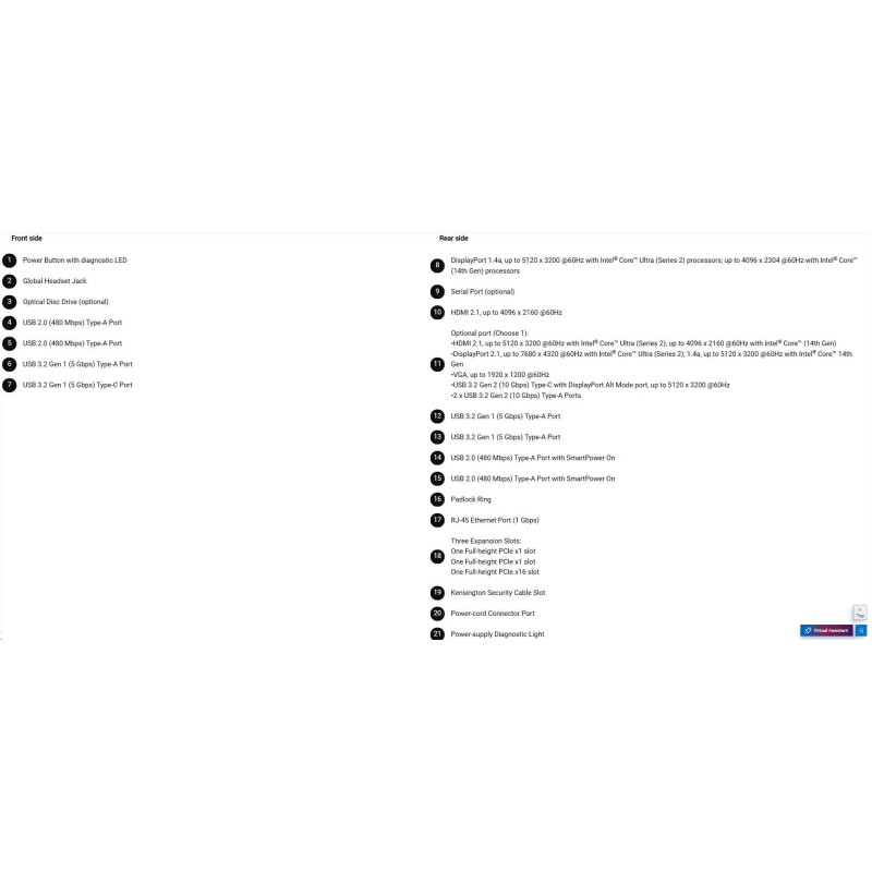 •HDMI 2.1, up to 5120 x 3200 @60Hz with IntelCore™ Ultra (Series 2); up to 4096 x 2160 @60Hz with IntelCore™ (14th Gen) •DisplayPort 2.1, up to 7680 x 4320 @60Hz with IntelCore™ Ultra (Series 2); 1.4a, up to 5120 x 3200 @60Hz with IntelCore™ 14th Gen •VGA, up to 1920 x 1200 @60Hz •USB 3.2 Gen 2 (10 Gbps) Type-C with DisplayPort Alt Mode port, up to 5120 x 3200 @60Hz •2 x USB 3.2 Gen 2 (10 Gbps) Type-A Ports