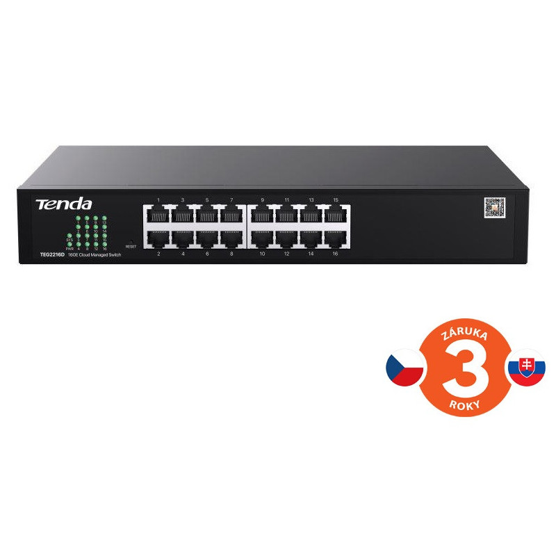 Tenda TEG2216D je 16ti portový Gigabitový L2 Websmart + Cloud switch . 16x 10/100/1000 Mb/s. Podporuje webový + cloud management, QVLAN, IGMP, DHCP snooping, DHCP client, IGMP fast leave, Storm control, Anti-ring, Speed limit, Port mirroring + aggregation. Rackmount.