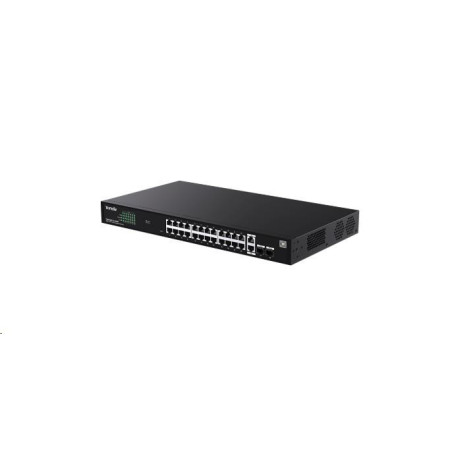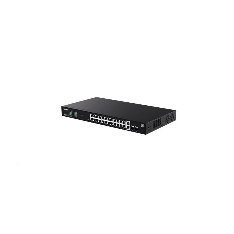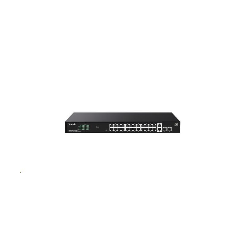 Tenda TEG2228P-24-410W je 26ti portový Gigabitový PoE L2 Websmart + Cloud switch. 24x 10/100/1000 Mb/s PoE 802.3af/at (celkem 370W) + 2x SFP 1000Mb/s. Podporuje webový + cloud management, QVLAN, IGMP, DHCP snooping, DHCP client, IGMP fast leave, Storm control, Anti-ring, Speed limit, Port mirroring + aggregation. Rackmount.