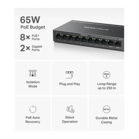 * 8× 10/100 Mb/s PoE+ portů a 2× gigabitové porty bez PoE