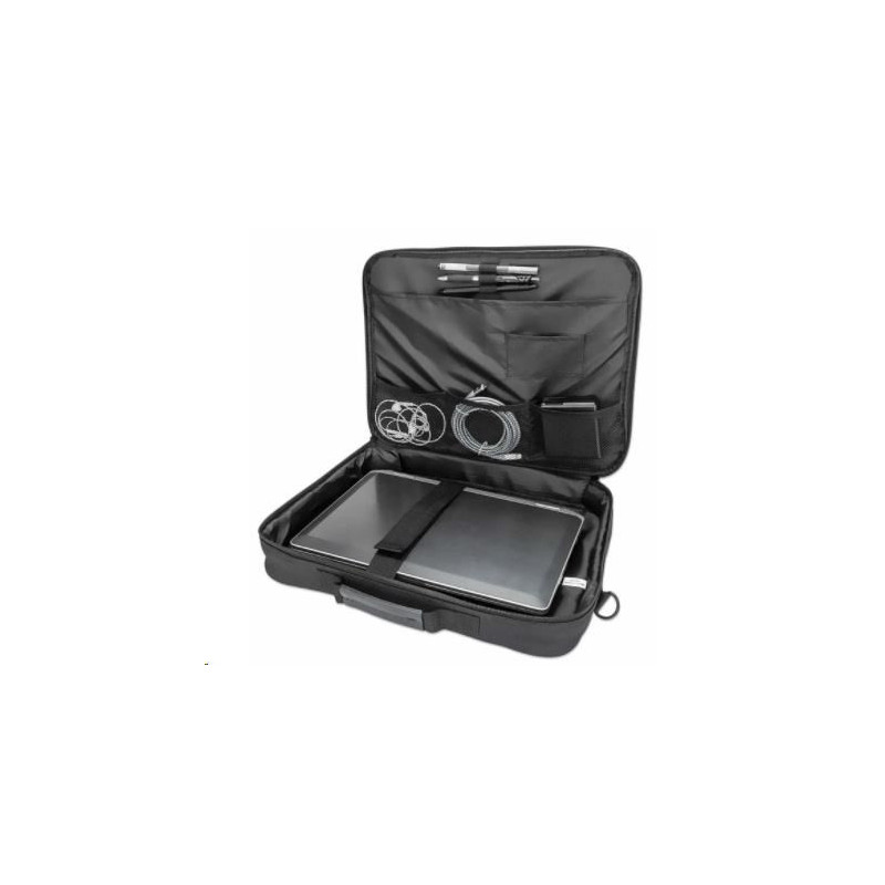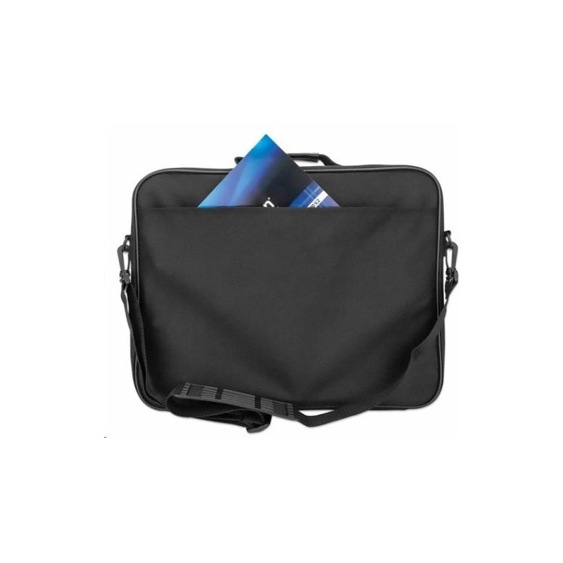 Many notebook bags are top loading, which means they form a sort of bucket inside the main compartment. If you have an inner pocket with several accessories, you are forced to pack them vertically on top of each other. The full clamshell opening of the Manhattan Cambridge Notebook Bag 15.6" makes access to the inner compartment much more convenient. This construction lets you find the right item easier, and it’s also makes it a big help with handling your laptop at airport security inspections. Beyond that, the Cambridge Notebook Bag features many stowing options that you’ll be glad to have on your trip. Never know where to safely put your or your customers’ business cards? A separately little pocket keeps them safe and crease-free. Large front, rear and interior pockets offer plenty of space for cables, files, headphones and more. The notebook compartment itself is amply padded to protect your valuable device from bumps and scratches. Thanks to its compact design, this Notebook Bag can be easily stowed in seat pockets or overhead bins. A sturdy handle and a removable, non-slip shoulder strap ensure safe and comfortable transportation.