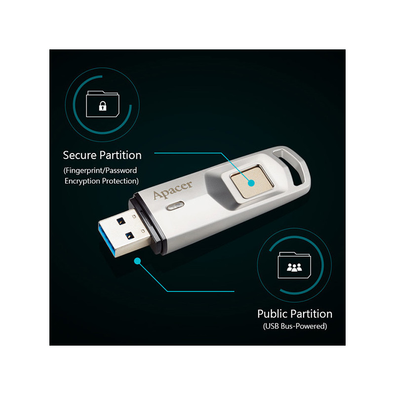 Paměťový prostor je rozdělen na 2 části. Veřejný oddíl lze použít k uchovávání méně citlivých dat, k nimž se přímo dostanete jako k jakékoli běžné USB flash jednotce. Zabezpečený oddíl nabízí šifrovanou bezpečnost přístupnou pouze rozpoznáváním otisků prstů nebo heslem.