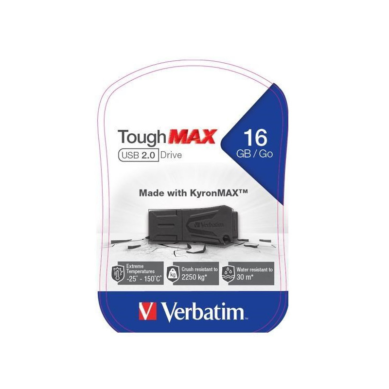 Disk Verbatim ToughMAX USB 2.0 je vyroben z kompozitních materiálů KyronMAX™, termoplastického materiálu nahrazujícího kov, který odolává opravdu náročným podmínkám a používá se v nejnáročnějších aplikacích od stíhacích letounů až po horská kola. Kompozitní materiály KyronMAX™ jsou extrémně lehké a odolné, a proto jsou skvělým materiálem pro pouzdro USB disku, který odolá prakticky všemu a ochrání vaše data před jakýmkoli fyzickým poškozením.