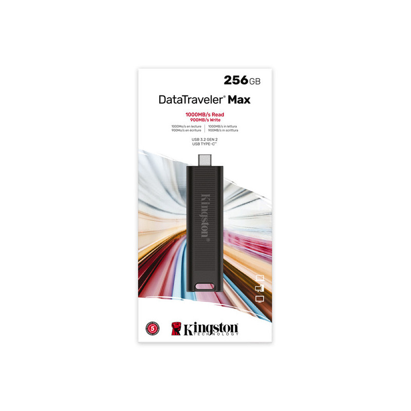 DataTraveler® Max značky Kingston je vysoce výkonný flash disk USB Type-C®1, který využívá nejnovější standard rozhraní USB 3.2 2. generace pro rekordní rychlost čtení/zápisu až 1000/900 MB/s2. Jedinečné pouzdro s prolisem, navržené s ohledem na přenosnost a pohodlí, chrání konektor, když ho nepoužíváte, a lze ho snadno přesunout jediným pohybem. DT Max nabízí špičkový výkon a rozšířené kapacity až 1 TB3, což z něj činí ideální řešení pro přenos a ukládání velkých digitálních souborů, jako jsou fotografie v rozlišení HD, videa v rozlišení 4K/8K, hudba a další.