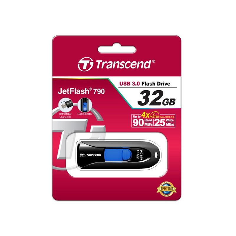 Tento model USB Flash disku Transcend JetFlash 790 nabízí kapacitu 32 GB, což zaručuje dostatek prostoru pro běžné každodenní použití při přenášení dokumentů a objemnějších multimediálních souborů. Pro připojení využívá vysokorychlostní rozhraní USB 3.0. Rozměry Flash disku činí 63.6 x 21.2 x 10.6 mm a hmotnost 4.9 g.