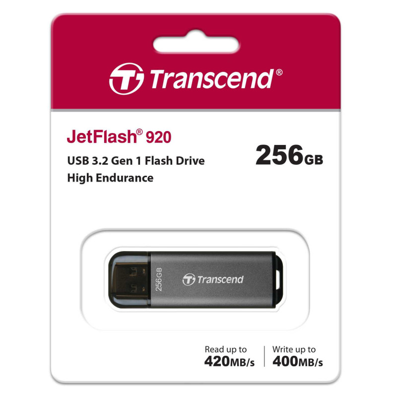 Introducing Transcend's high endurance, high performance JetFlash 920, a USB flash drive that is anything but ordinary. Boasting sensational read speeds of up to 420MB/s and write speeds of up to 400MB/s, the JetFlash 920 delivers top-notch performance in a sleek and portable design. Its aluminum metallic housing will safeguard your data wherever you go.