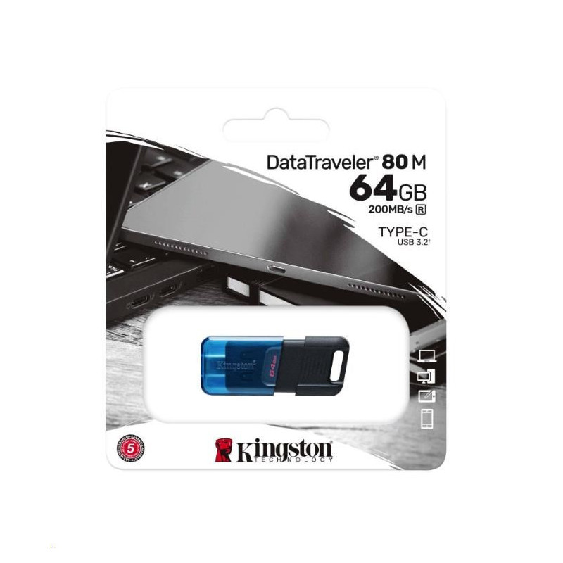 Kingston DataTraveler 80 M is a high-performance flash drive designed to work with USB Type-C1 laptops, desktops, smartphones and tablets without the need for an adapter. With extremely fast read speeds of up to 200MB/s2, the DataTraveler 80 M allows for quick and convenient storage and file transfers. The compact, moving cap design features a key ring loop, making it ideal for on-the-go storage.