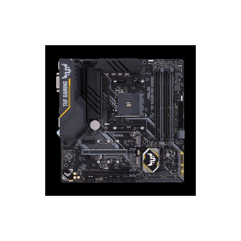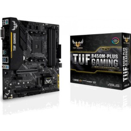 AMD B450 mATX gaming motherboard with Aura Sync RGB LED lighting, DDR4 3533MHz support, Dual M.2, and native USB 3.1 Gen 2.