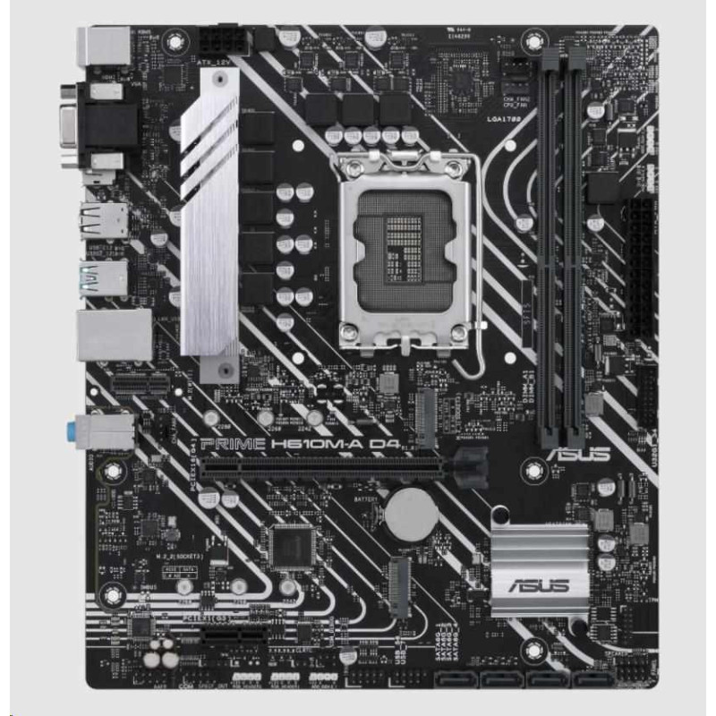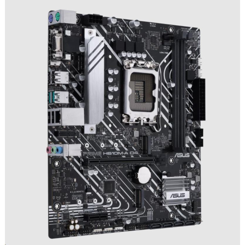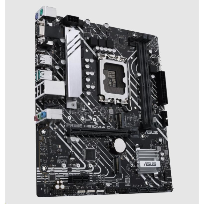 Intel H610 (LGA 1700) micro-ATX motherboard with DDR4, PCIe 4.0, dual M.2 slots, Intel 1 Gb Ethernet, DisplayPort, HDMI, D-Sub, USB 3.2 Gen 2 ports, SATA 6 Gbps, Addressable Gen 2 headers, and Aura Sync