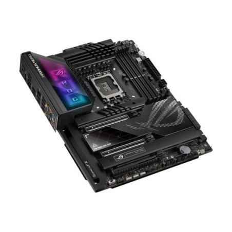Intel Z790 LGA 1700 ATX motherboard with 20 + 1 power stages, DDR5, five M.2 slots, PCIe 5.0 NVMe SSD slot on Hyper M.2 Card, PCIe 5.0 x16 SafeSlots with Q-Release, Wi-Fi 6E, two Thunderbolt™ 4 ports, USB 3.2 Gen 2x2 front-panel connector with Quick Charge 4+ up to 60W, AI Overclocking, AI Cooling II, and Aura Sync RGB lighting