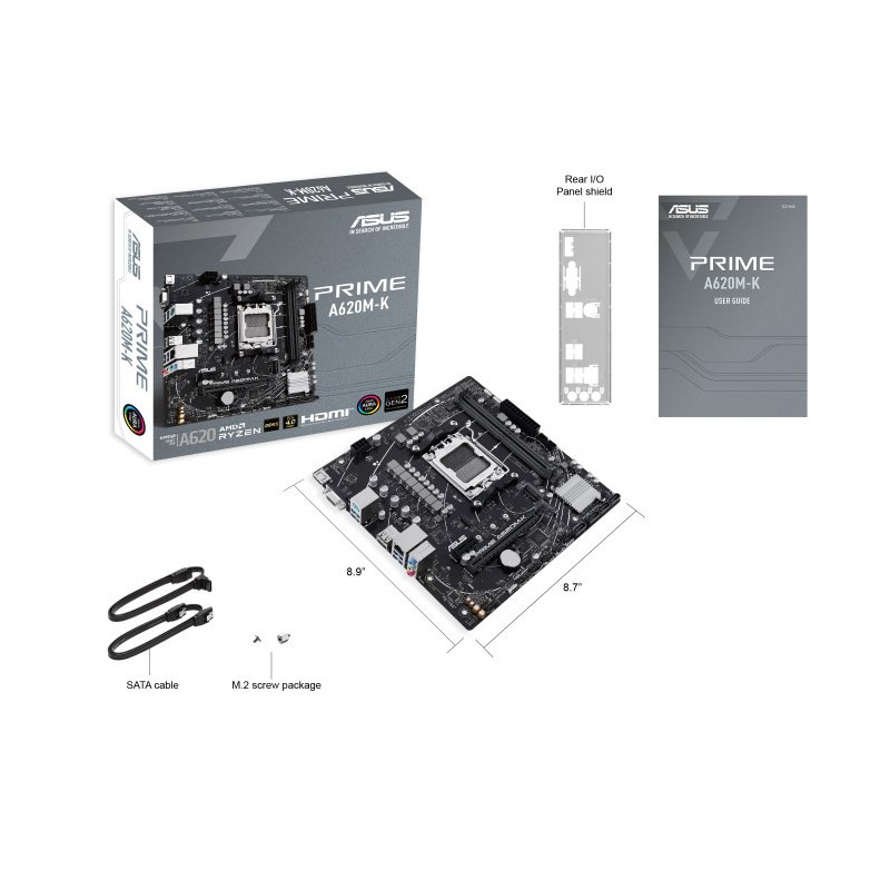 AMD A620 micro-ATX motherboard, DDR5, PCIe 4.0 Graphics card and PCIe 4.0 M.2 support, HDMI™, VGA, USB 3.2 Gen 1 Type-A, SATA 6 Gbps, Two-Way AI Noise Cancellation, Aura Sync