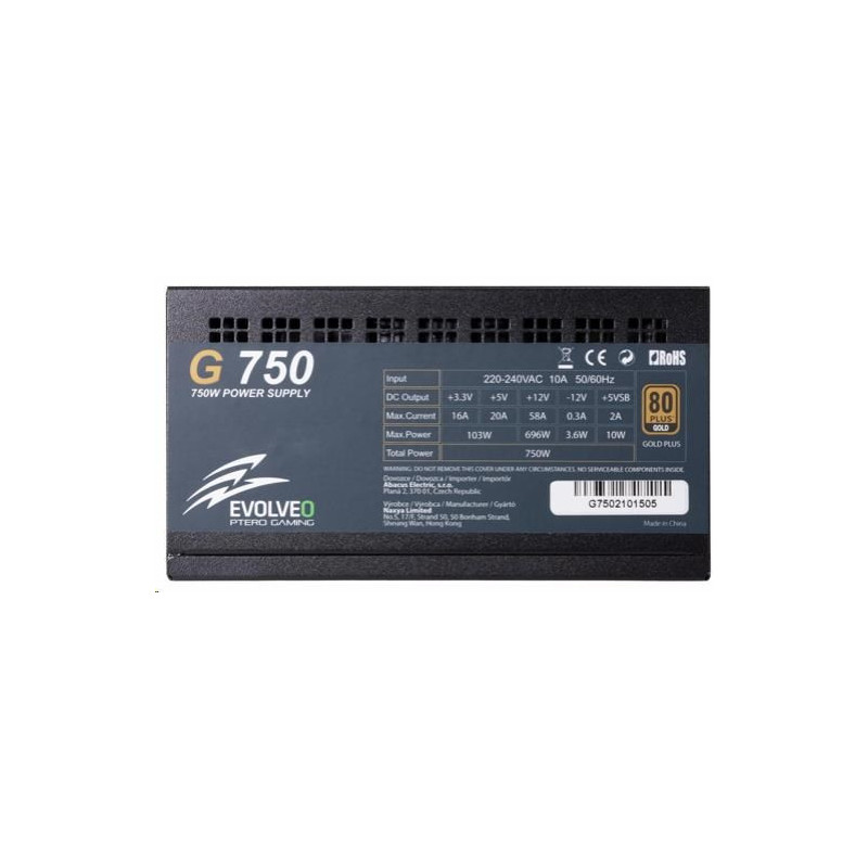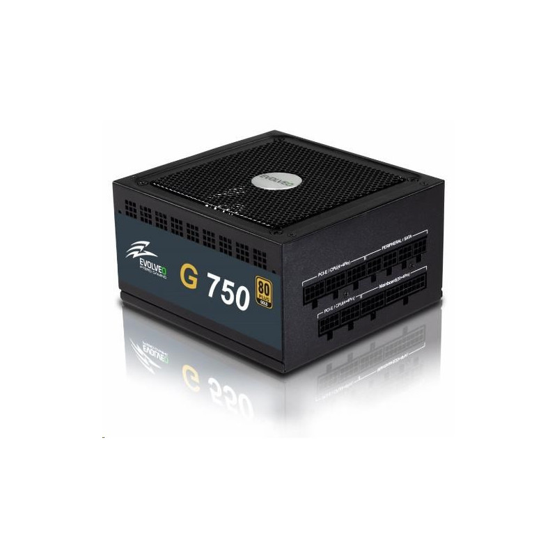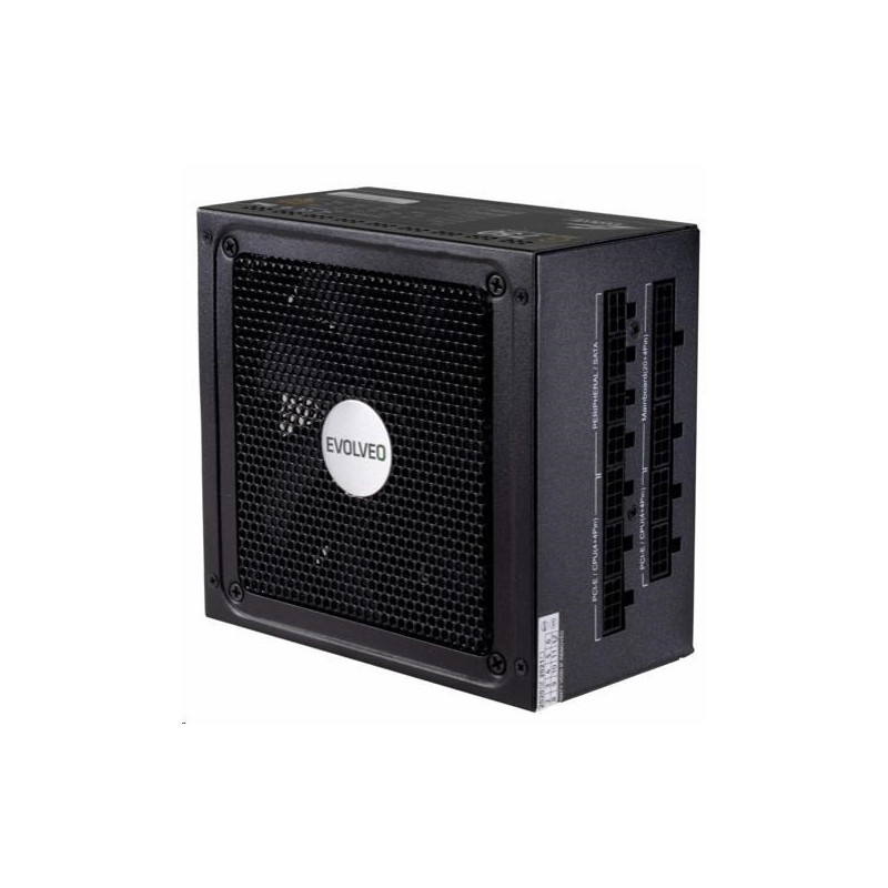 Zdroj EVOLVEO G750 je ideální volba do jakéhokoliv herního počítače. Vyjímá se především účinností s certifikací 80 PLUS GOLD zaručující účinnost až 90%. Zdroj je plně modulární, z toho důvodu je možné připojit jen nejnutnější kabely. Součástí je i tichý 140mm ventilátor. V kombinaci se semi-pasivním chlazení do 30% zatížení je zaručen tichý chod zdroje. Nedílnou součástí jsou i ochrany proti poškození komponent v PC a i zdroje samotného.