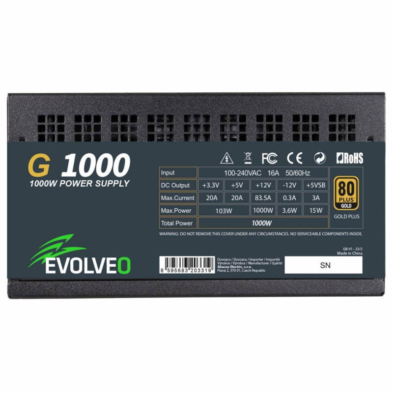 Zdroj EVOLVEO G1000 je ideální volba pro herní počítač, který má osazenou grafickou kartu s rozhraním PCIe 5.0. Vyjímá se především účinností s certifikací 80 PLUS GOLD zaručující účinnost až 90%. Zdroj je plně modulární, z toho důvodu je možné připojit jen nejnutnější kabely. Součástí je i tichý 140mm ventilátor. Vzhledem k velkému výkonu nemá tento zdroj semi-pasivní chlazení. Ventilátor zdroje je v stále v provozu a jeho otáčky jsou regulovány v závislosti na potřebě chlazení
