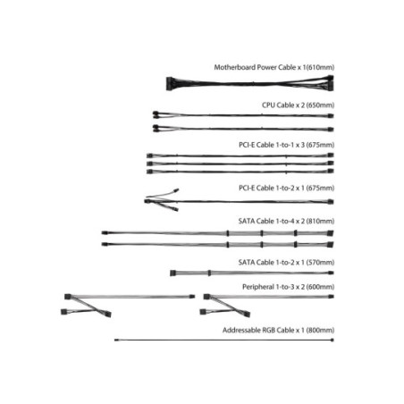 | Obsah balenia | Napájací kábel x 1 Napájací kábel základnej dosky (24-pinový) x 1 Kábel CPU (4+4-pinový) x 2 Kábel PCI-E (6+2-pinový) x 3 Kábel SATA x 3 Periférny kábel x 2 Kábel SATA na periférny kábel x 1 Adresovateľné káble RGB x 2 Nálepka ROG x 1 Viazacia páska na káble ROG x 4 Hrebene s puzdrom (6-pinový) x 2 Hrebene s puzdrom (8-pinový) x 6 Hrebene s puzdrom (24-pinový) x 2 Balenie skrutiek do šasi x 1 Viazacia páska na káble x 10 Návod na použitie x 1 |