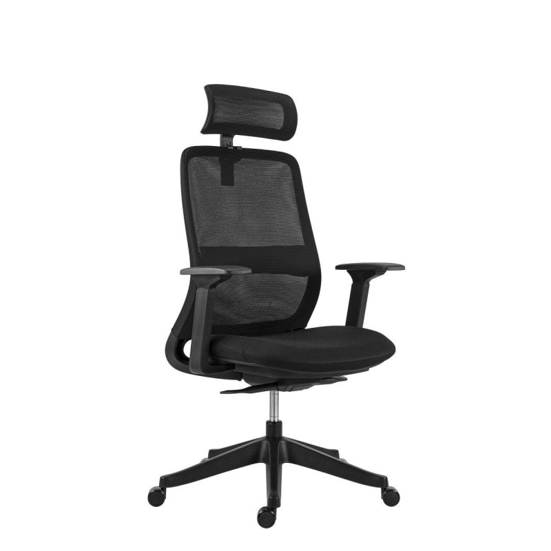• kancelářská židle se sítí na opěráku a podhlavníku, čalouněný sedák • synchronní mechanismus s možností plynulé proměny úhlu sedáku a opěráku, možnost aretace ve 4 pozicích, automatické nastavení tuhosti mechanismu podle tělesné hmotnosti uživatele • výškově a úhlově nastavitelný podhlavník • výškově nastavitelná bederní opora • pevné celoplastové područky • kolečka O 50 mm pro všechny typy podlah • pohodlný sedák, studená pěna vstřikovaná do formy (moulded foam) • barva síťoviny a potahu: černá • nosnost: 130 kg • záruka: 24 měsíců